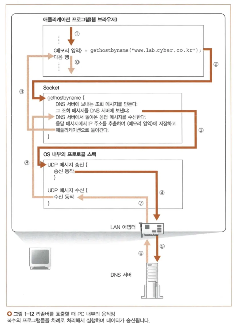 우선 DNS 서버에 문의하기 위한 메시지를 만들고, 그 후 OS 내부에 포함된 프로토콜 스택을 호출하여 메시지를 DNS 서버에 보냅니다. (리졸버도 브라우저와 같이 네트워크에 대해 데이터를 송/수신할 수 있는 기능이 없음)